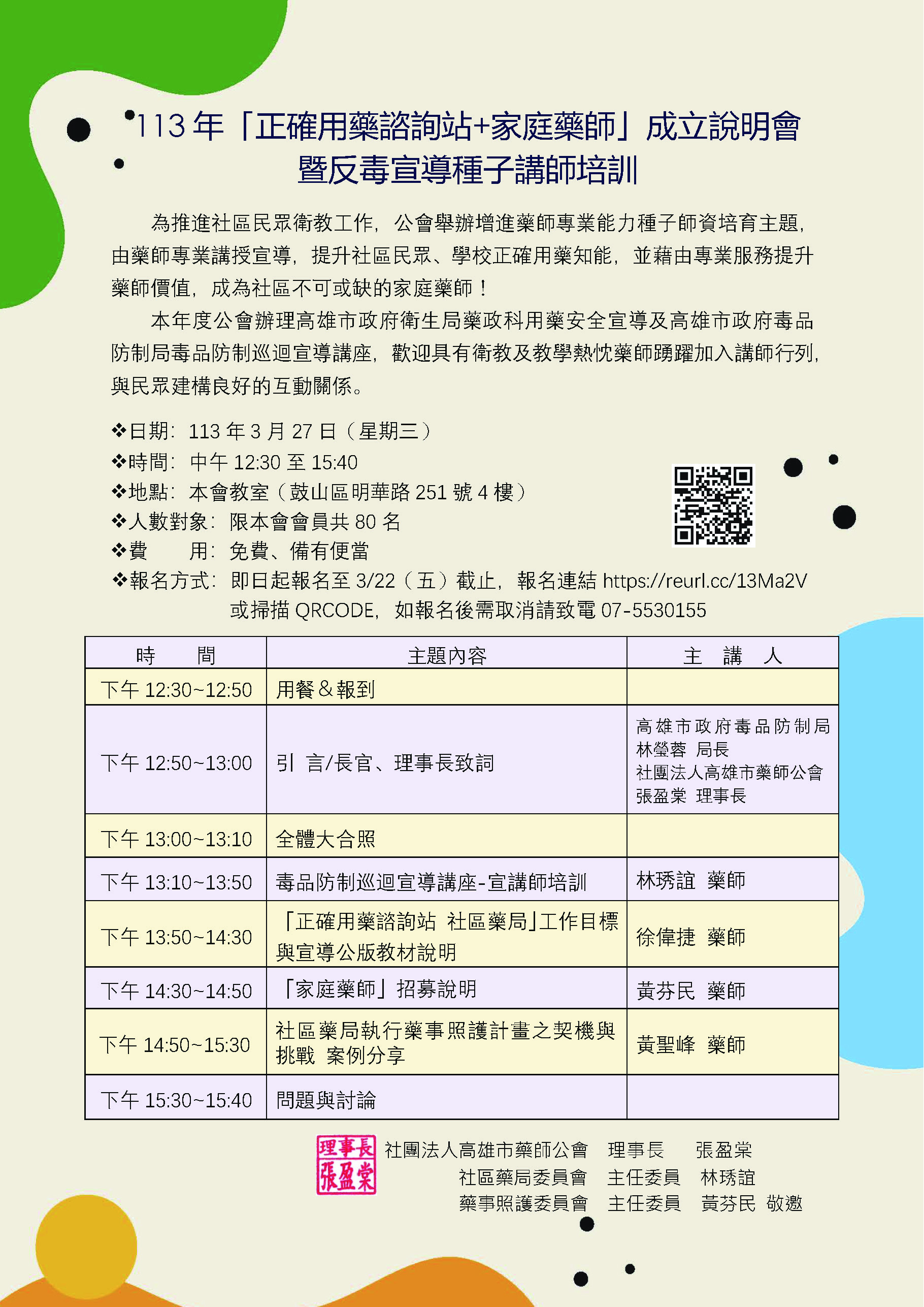 1130327「正確用藥諮詢站+家庭藥師」成立說明會暨反毒宣導種子講師培訓