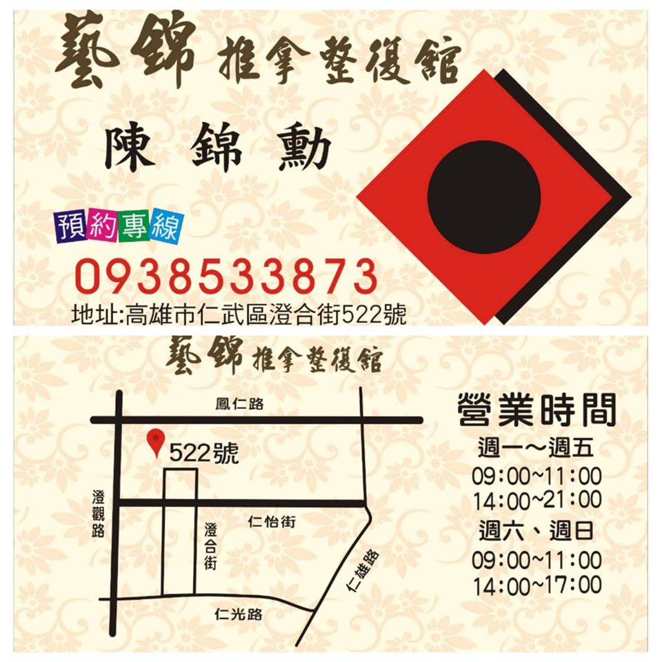 藝錦傳統推拿整復館高雄市仁武區澄合街522號 預約專線:0938-533873營業時間:週一至週五9:00~11:00、14:00~21:00週六至週日9:00~11:00、14:00~17:00即日起推出~高雄市藥師公會會員優惠 消費時出示公會相關證件即可享有85折優惠 歡迎加LINE詢問 ...